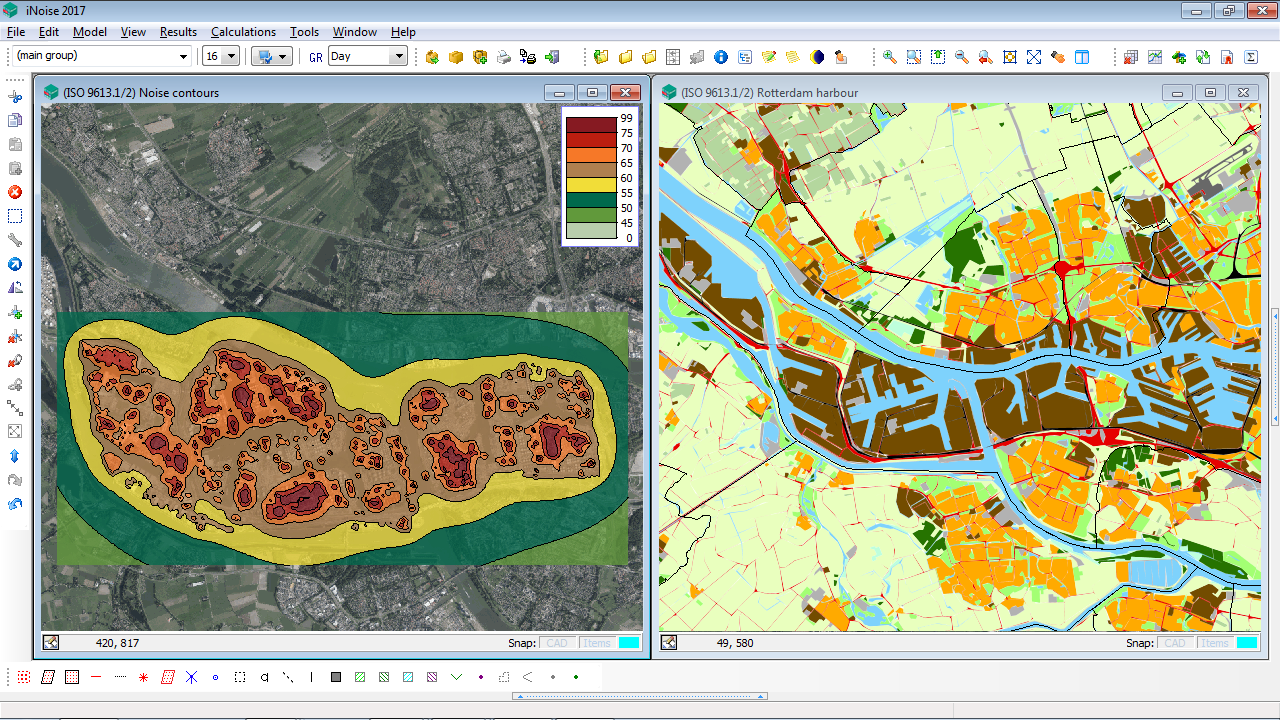 Para la elaboración de mapas acústicos precisos, utilizamos el software especializado INOISE, desarrollado por DGMR Software. Esta herramienta de referencia en la predicción acústica en exteriores permite realizar simulaciones basadas en normativas internacionales, considerando factores clave como la topografía del terreno y la caracterización de las fuentes de ruido.